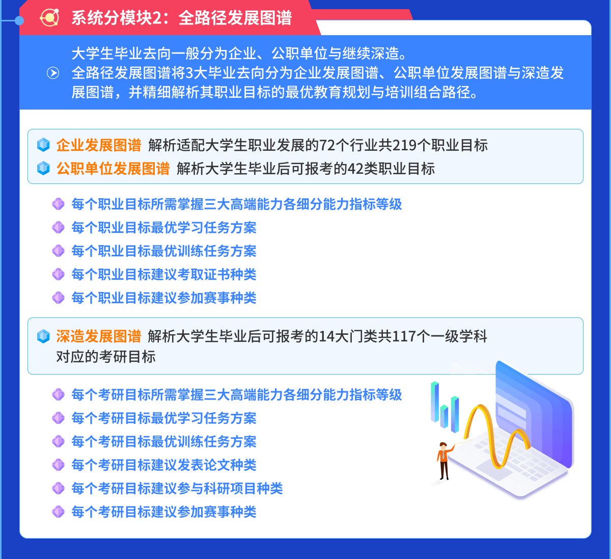 根据对超过1277家全行业龙头企业、典型事业单位和政府机构的深层研究。一切社会组织对大学生的价值判断,主要决定于三类高端能力体系的综合强度,对大学生的招录选拔都是针对三类高端能力所细分的18个指标进行测评判断。只是不同类型机构在18个细分指标的评分权重有所不同